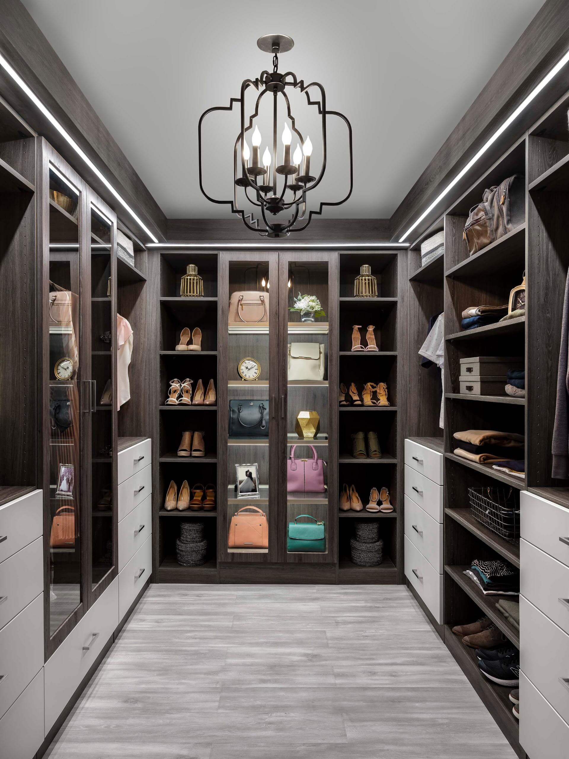 This expansive master closet features custom storage, specialized drawers for accessories, and integrated lighting that highlights the client's collectibles.