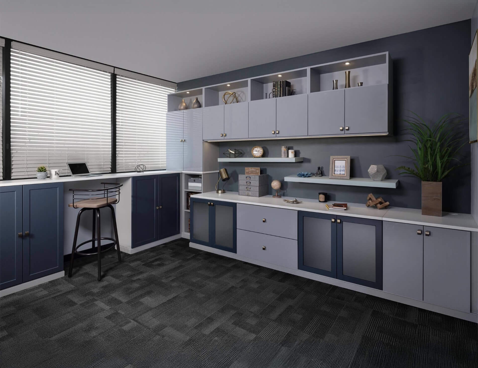 Create a sophisticated workspace with custom desks, shelving, and integrated organization systems